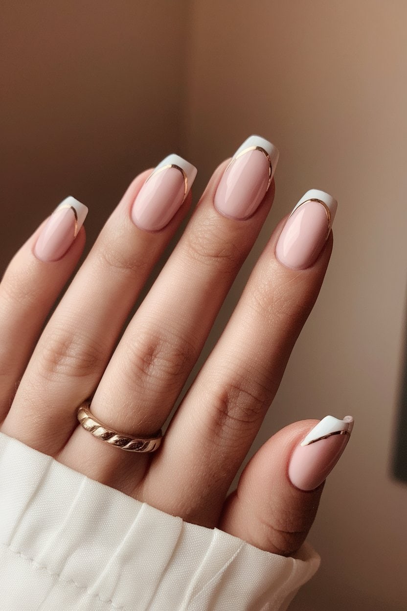 French tips with gold accents bring a chic twist to a classic look. The combination of a nude or soft pink base with metallic gold at the tips creates a sophisticated style.
