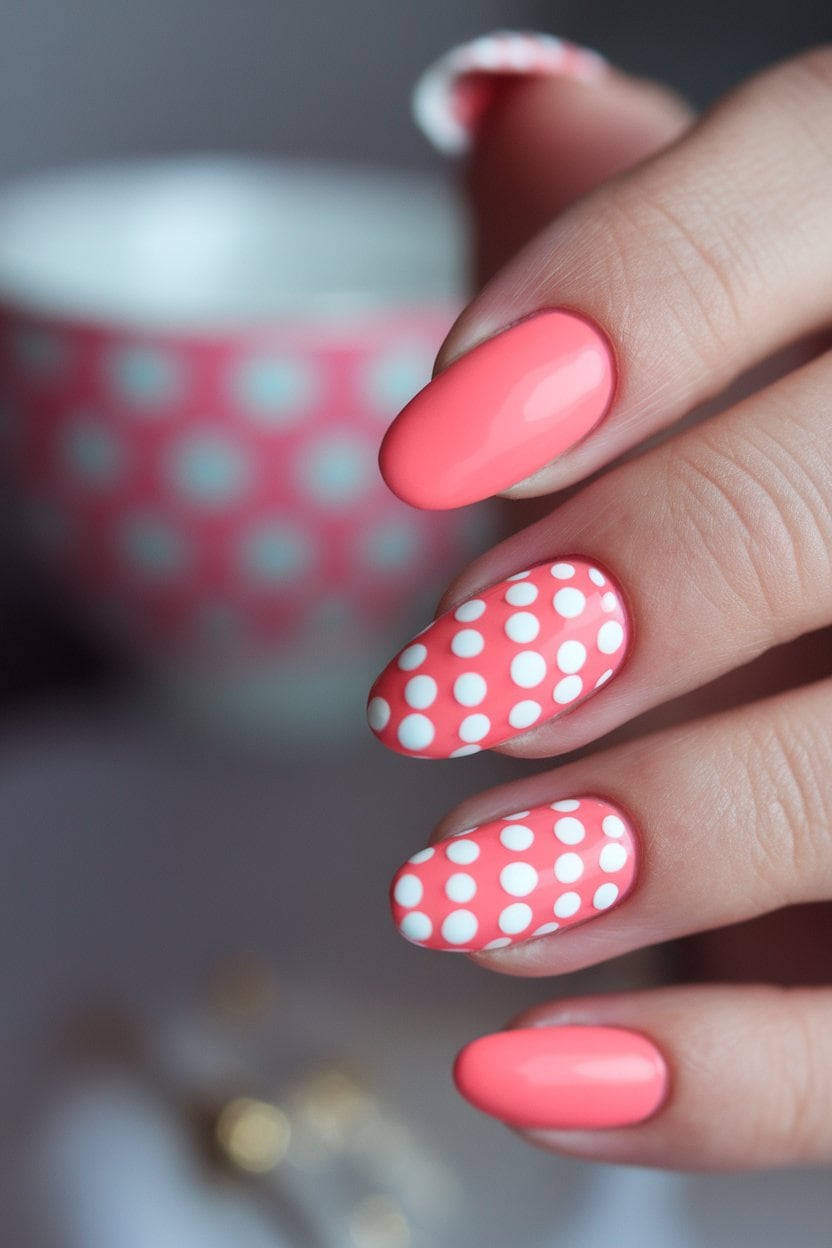 Coral with white polka dots is a fun and stylish choice for your nails. The bright coral base really pops, while the white dots add a playful touch.