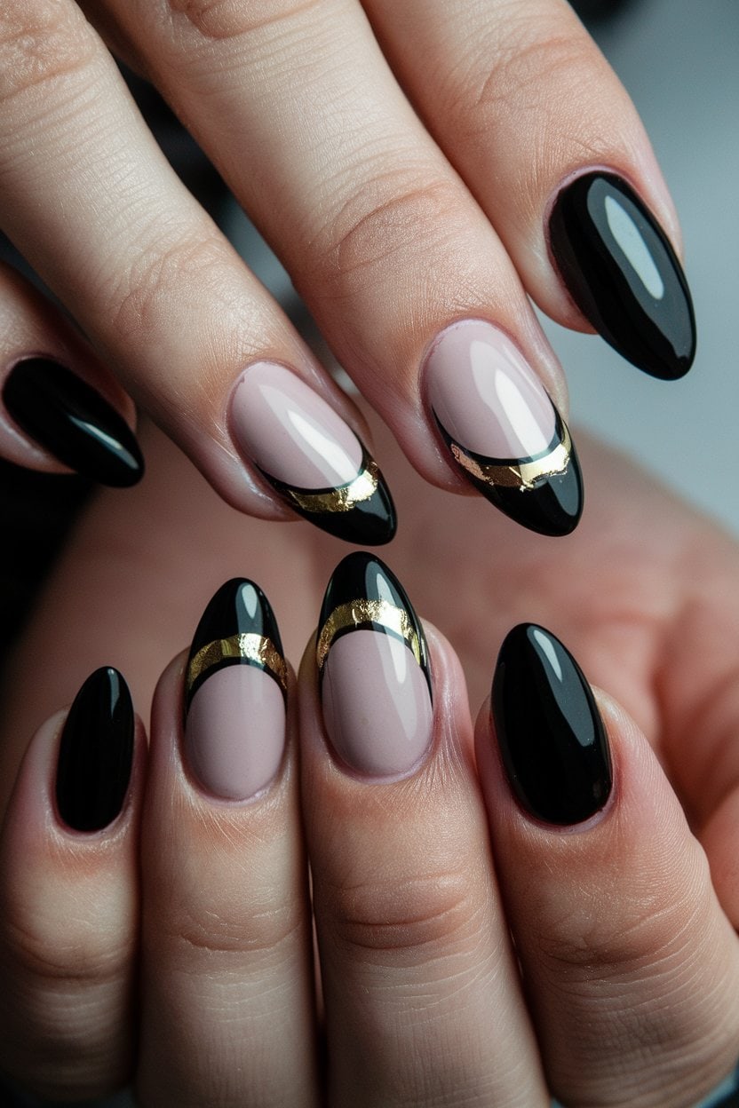 Black and nude half moon nails are a sleek choice that blends elegance with a touch of edge. This design features a nude base with a striking black crescent at the cuticle.