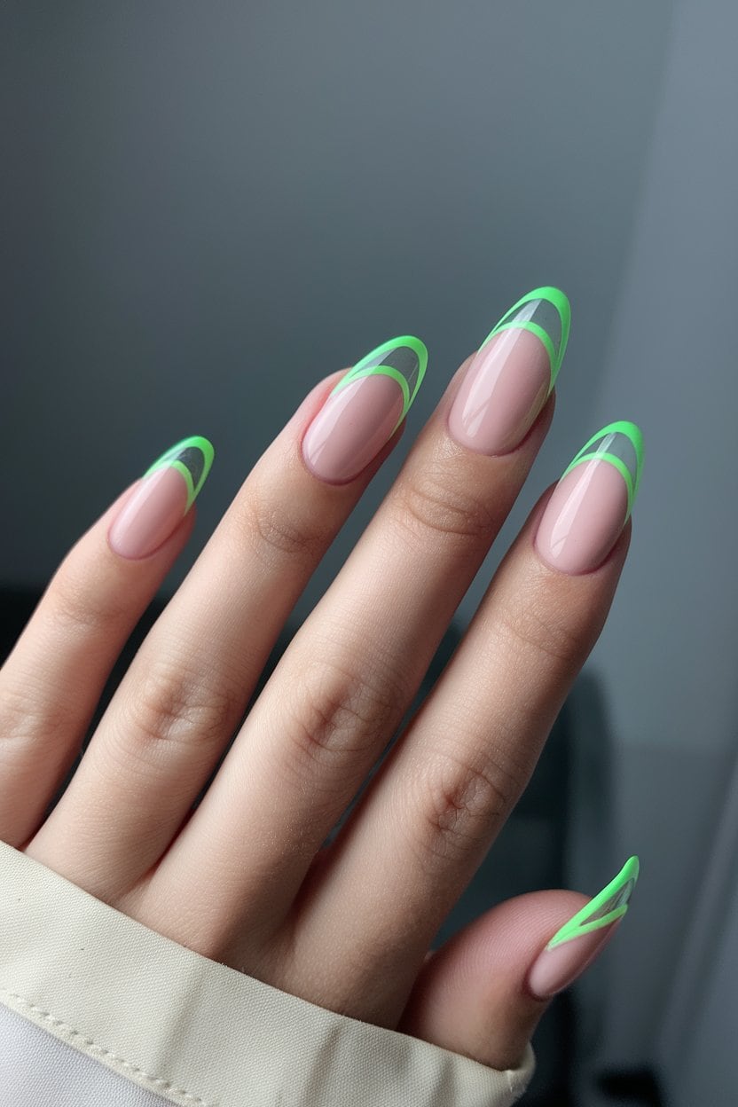 Start with a nude polish for a clean foundation. Then, apply neon shades to the tips for a striking contrast.
