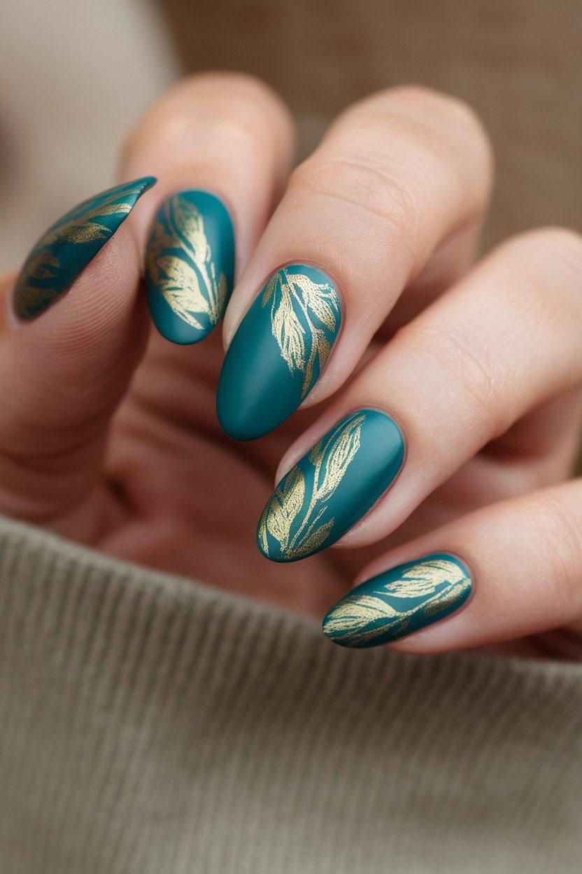 Teal with gold leaves creates a stunning combination. The rich teal color acts as a beautiful backdrop for the shimmering gold accents.