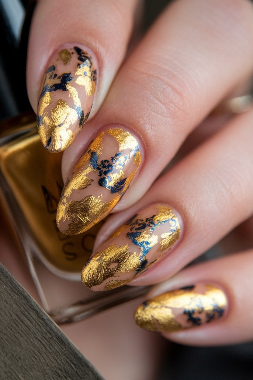 Golden foil nail art brings a touch of glam to your manicure. This style can range from subtle accents to bold, eye-catching designs, making it versatile for any occasion.