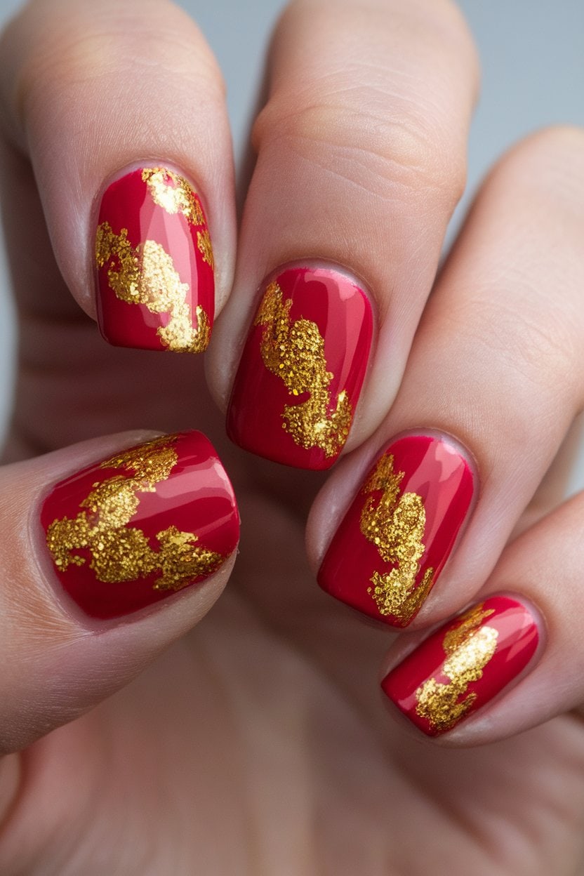 Bold red with gold glitter creates a stunning look that catches the eye. This combination adds a touch of glamour to any manicure.