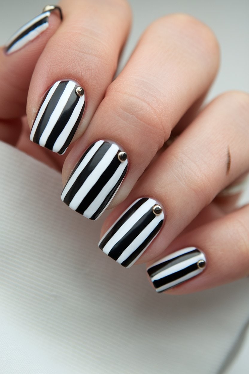 Try pairing these stripes with contrasting colors or metallic accents for added flair. Black and white stripes make a great base for nail art, allowing you to personalize your style further.
