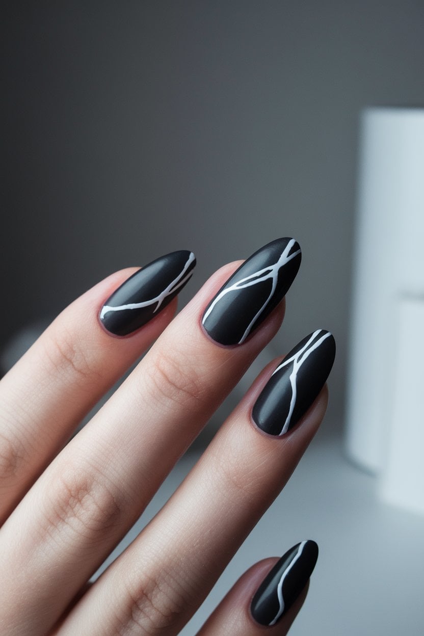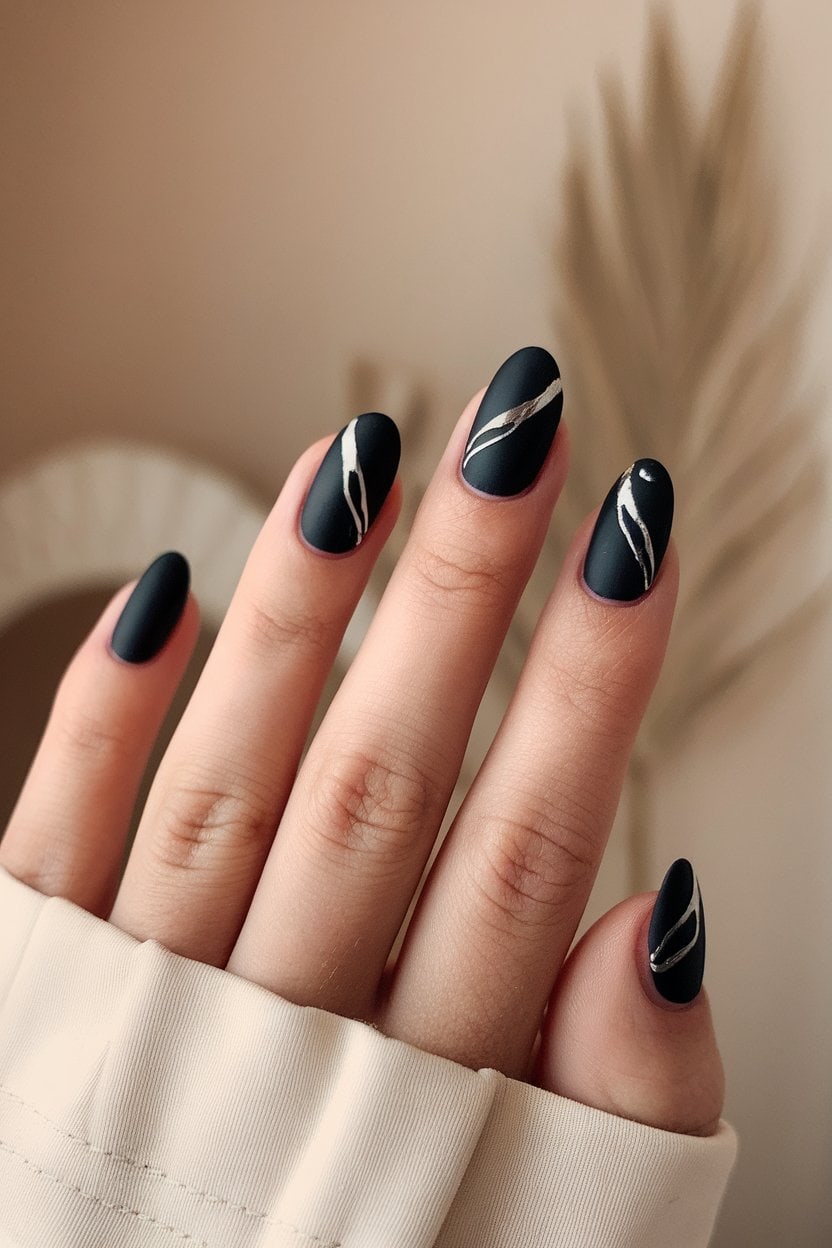 Start with a solid matte black base for a striking backdrop. It gives your nails a chic, understated vibe that pairs beautifully with silver accents.