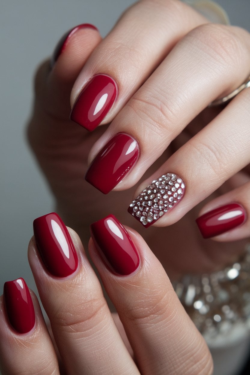 Classic red nails are always a chic choice. Adding rhinestones takes this look to the next level. It blends timeless elegance with a touch of glam.