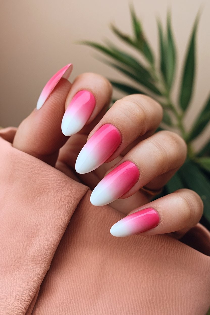 Ombre pink to white nails create a beautiful gradient effect. This design blends soft pinks with crisp whites, giving a fresh and elegant vibe.