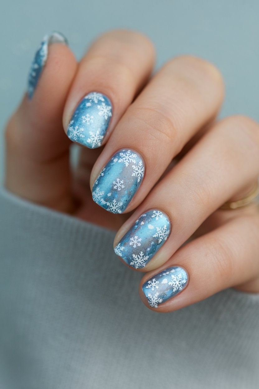 Frosty blue shimmer nails are perfect for some seasonal elegance! Start with a light blue base coat reflecting the chilly vibes of the season.