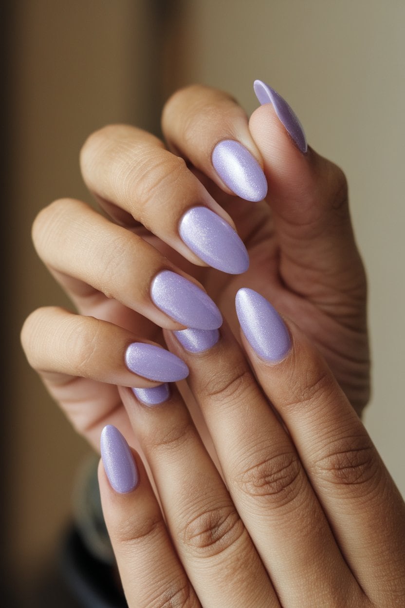Lavender shimmer finish adds a touch of elegance to your nails. This style combines a soft lavender base with a delicate shimmer that catches the light beautifully.