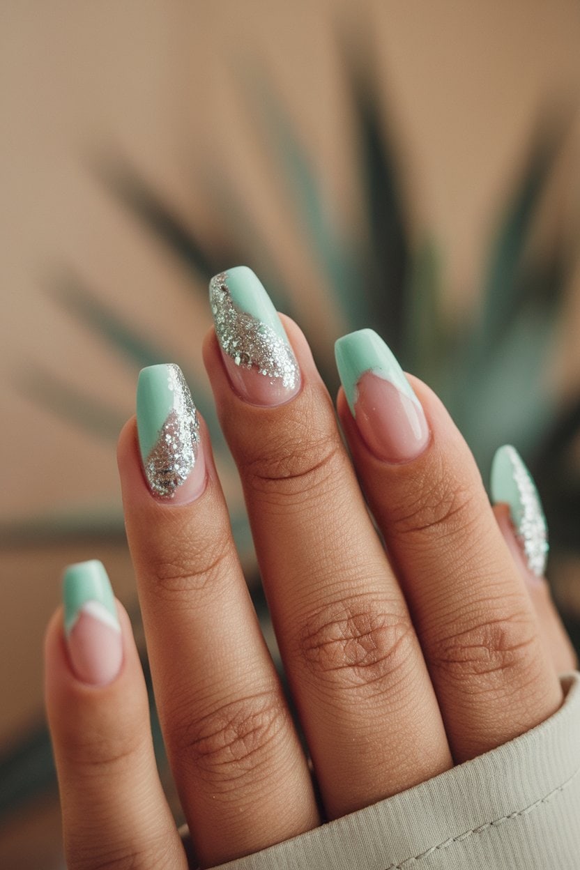 Adding silver glitter takes it up a notch. The sparkle contrasts nicely with the mint green, adding a fun twist without being too flashy.