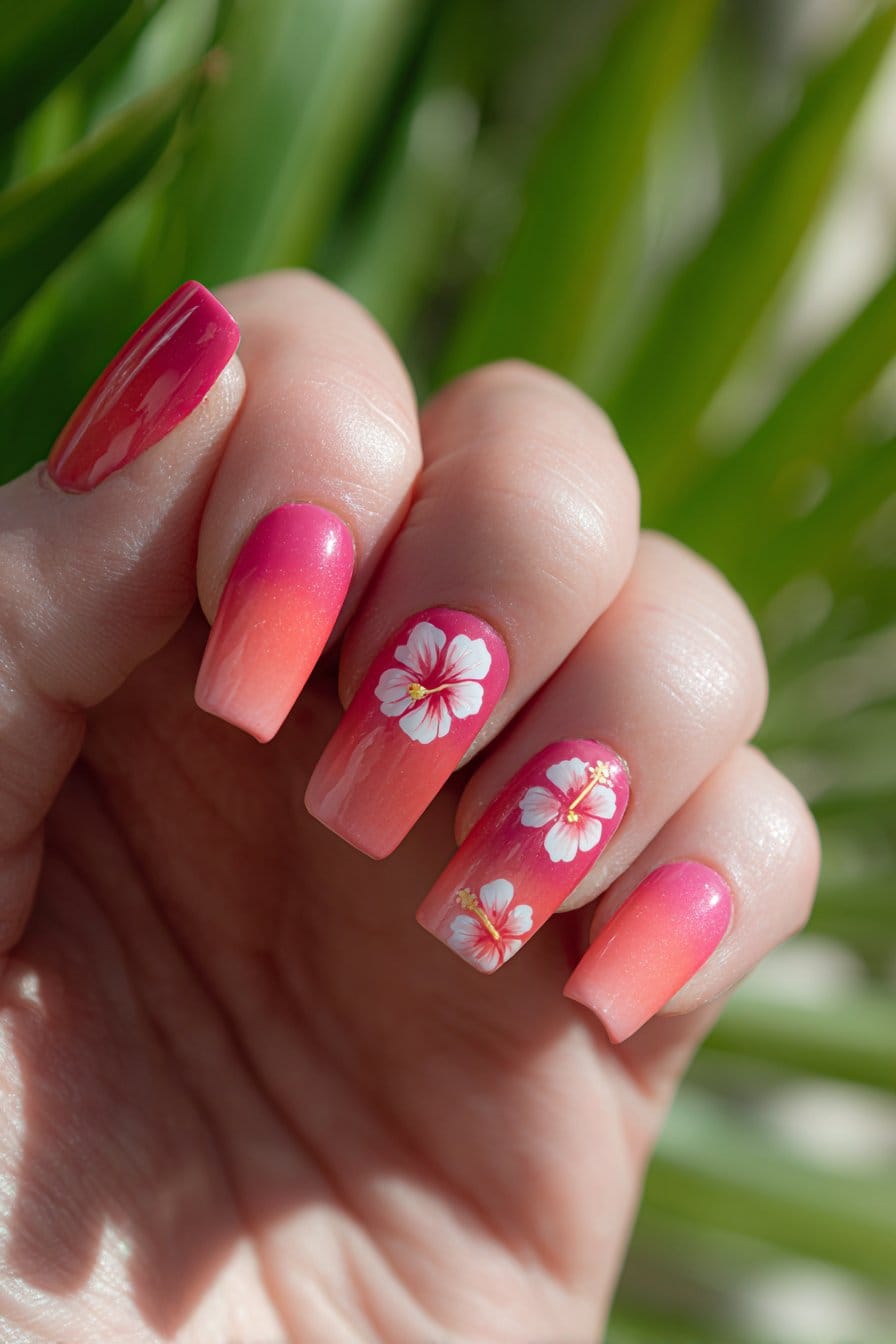 You can create a soft tropical look by blending pink into coral across your nails. The smooth gradient gives a natural background that makes hibiscus petals pop without feeling too bold.